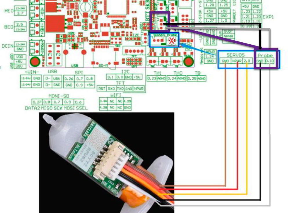 Este esquema depende de la versión de Marlin cargada en la impresora, normalmente a partir de la 2.0.7.x se puede usar el puerto dedicado PROBE en la placa si no se deberá utilizar el puerto Z-STOP.